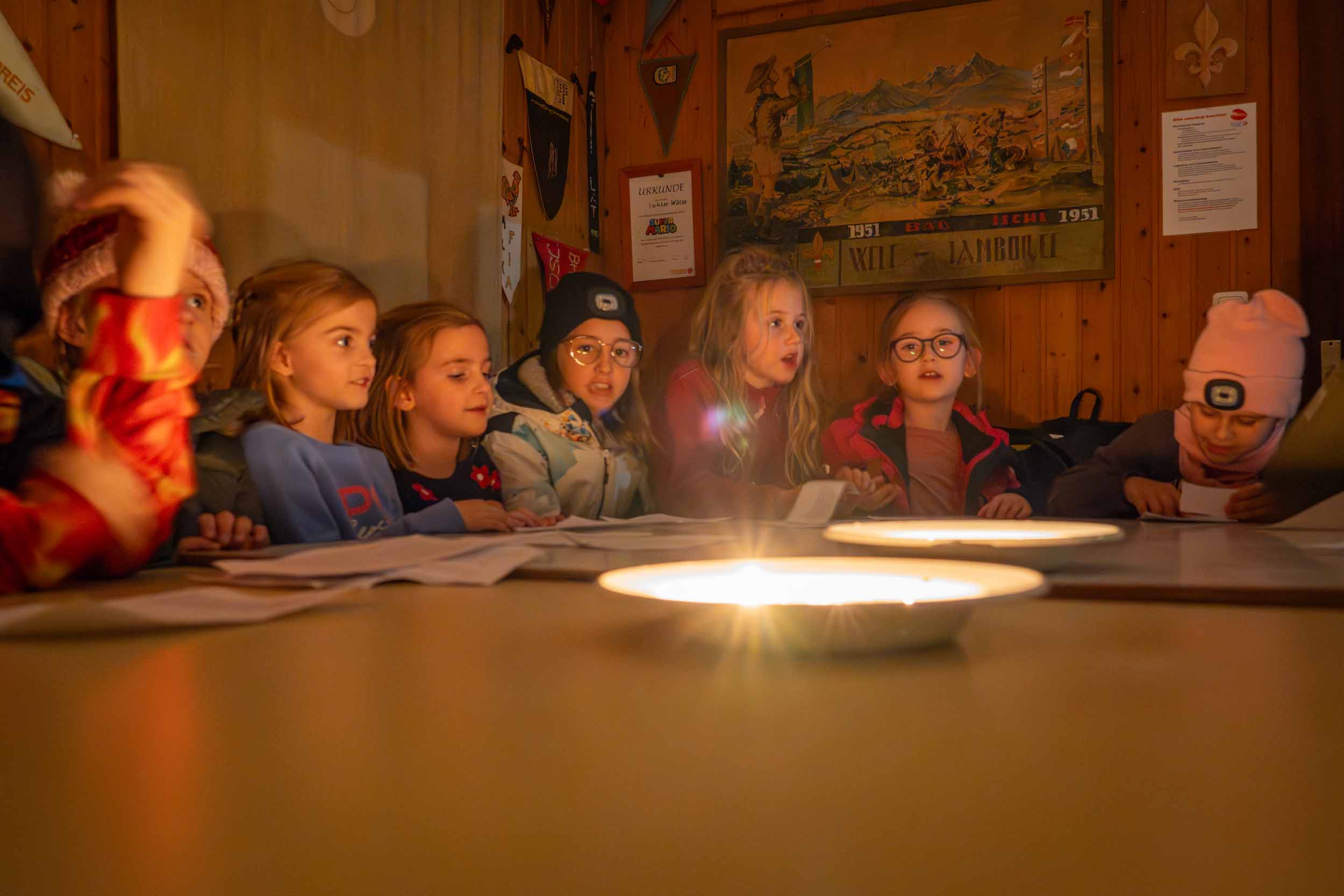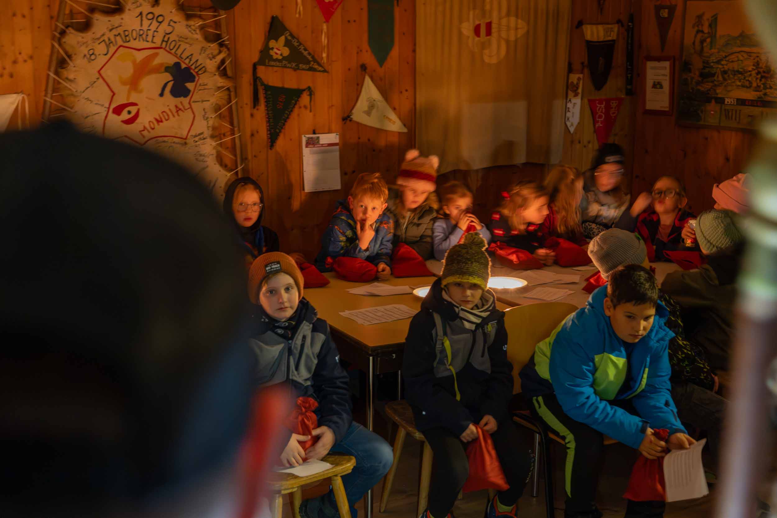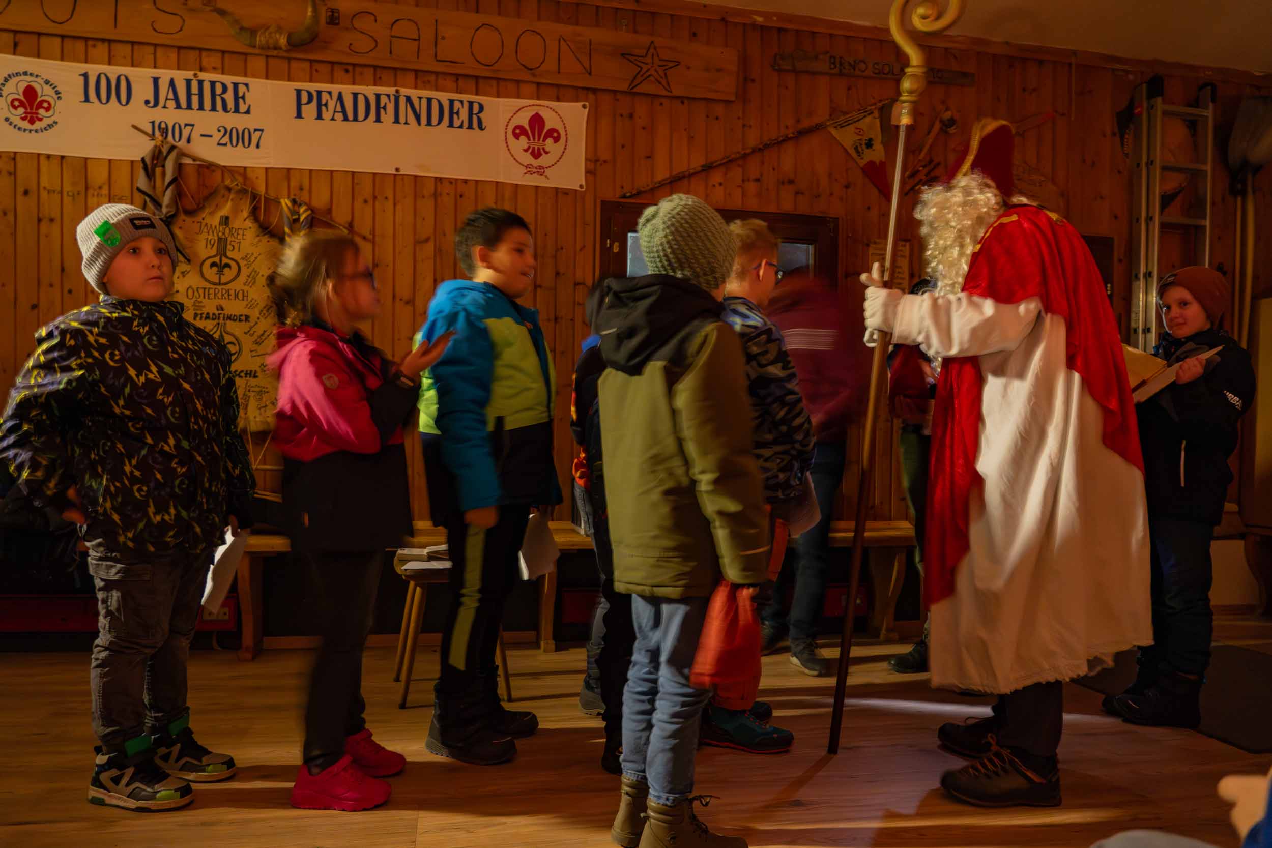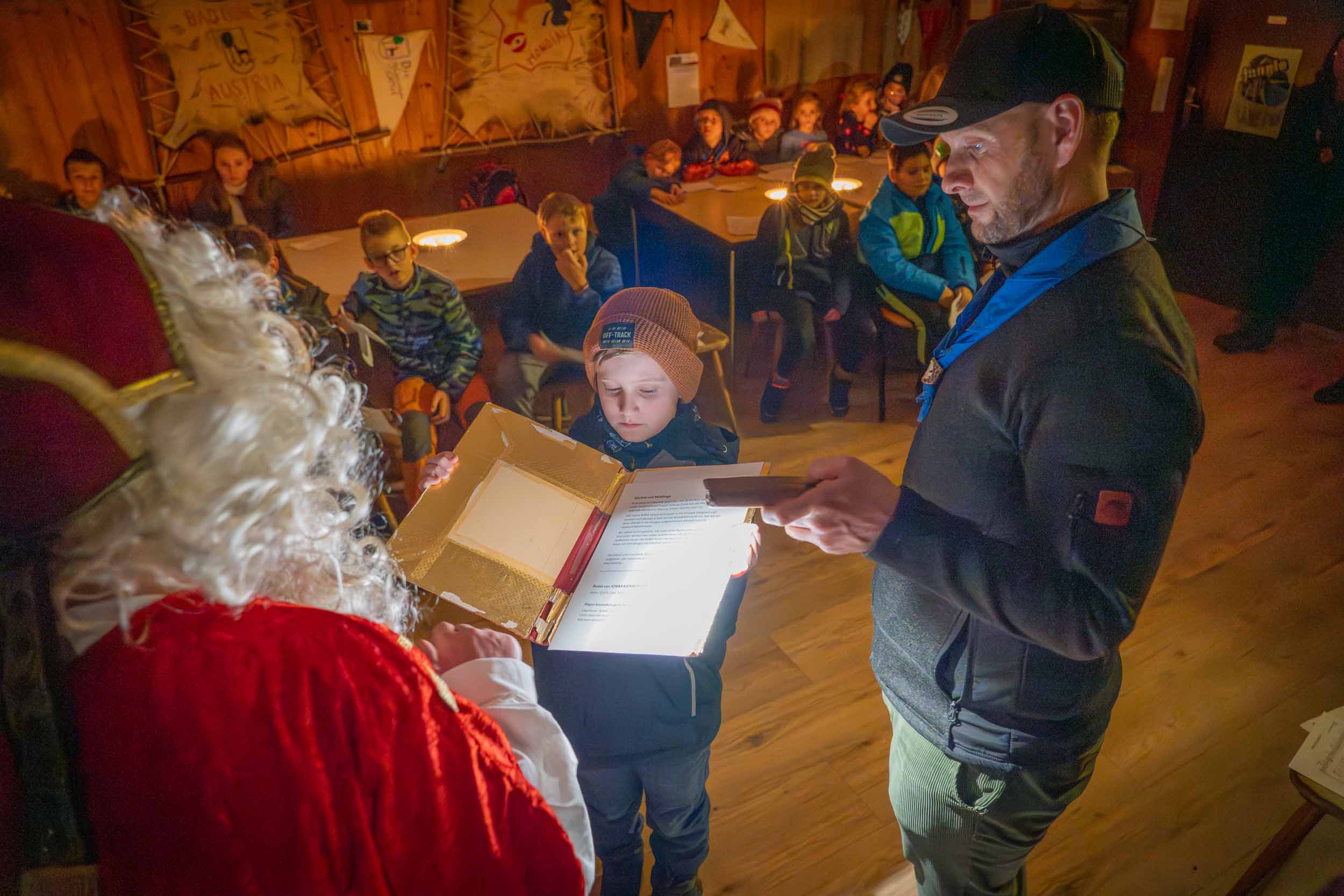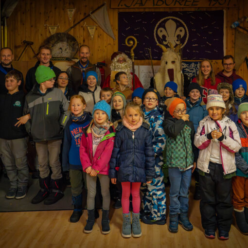 Er hatte jedenfalls sein berühmtes, schweres, goldenes Buch dabei, in dem wirklich ALLES über unsere Gruppe stand. Wer war neu dabei? Wer ist schon ein alter Hase im Pfadfinder-Dschungel? Und – Trommelwirbel – wer hat welche Stärken? Den Nikolaus entgeht nix! Er verteilte nicht nur Lob, sondern schob auch charmante Verbesserungsvorschläge hinterher: „Du bist ein super Knotenbinder, aber gemeinsam seid ihr noch stärker! Pfadfinder halten zusammen, das macht es aus…!“