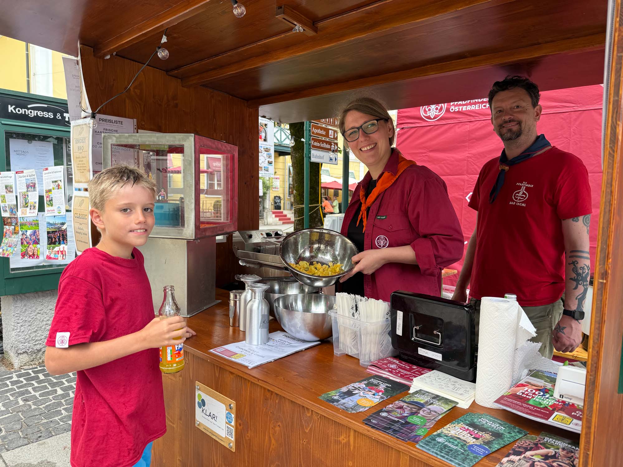 Wer fleißig lacht, braucht natürlich auch etwas für den Magen. Unsere Jugendlichen servierten knusprige Erdäpfel-Chips, frisch zubereitet und so schnell ausverkauft, dass sogar unsere Pfadi-Köche ins Schwitzen kamen. Wer zu spät kam, musste leider hungrig weiterziehen – echte Pfadfinder lernen eben, rechtzeitig zuzugreifen.