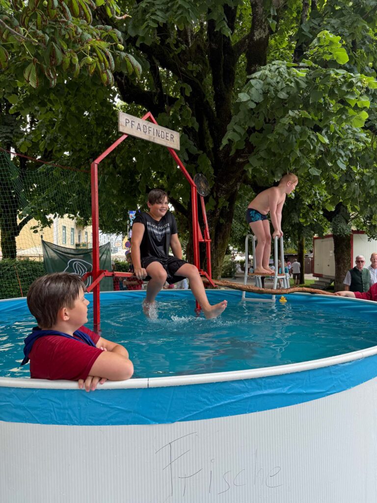Wer uns am Pfadfinder-Stand beim Kurpark besucht hat, weiß: Bei uns geht’s nicht nur ums Wandern und Knoten machen – bei uns wird auch ordentlich gelacht und geplantscht. Das beliebte „Pfadis versenken“ im Wasserbecken wurde zum echten Publikumshit. Große und kleine Stadtfest-Besucher ließen nichts unversucht, unsere tapferen Pfadis im kühlen Nass zu versenken – mit Erfolg und jeder Menge Wasserspaß!